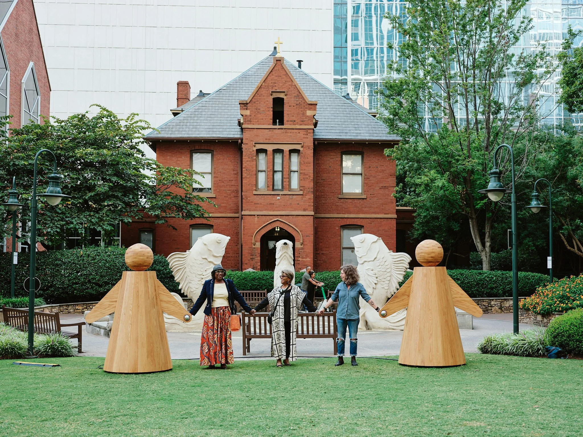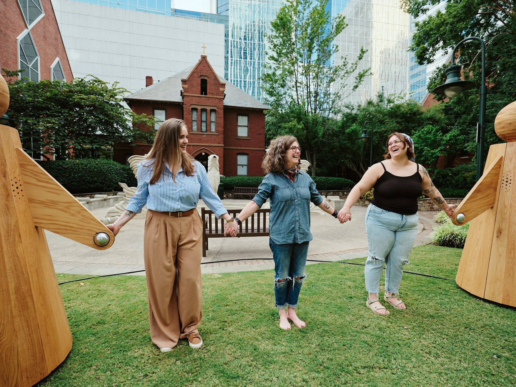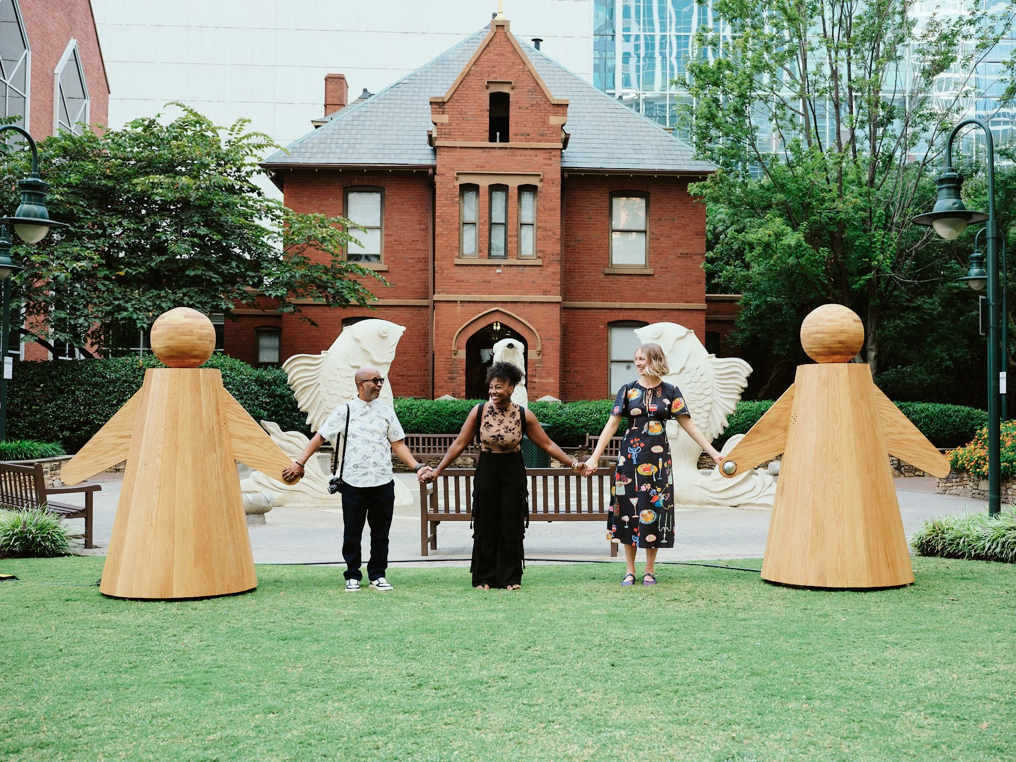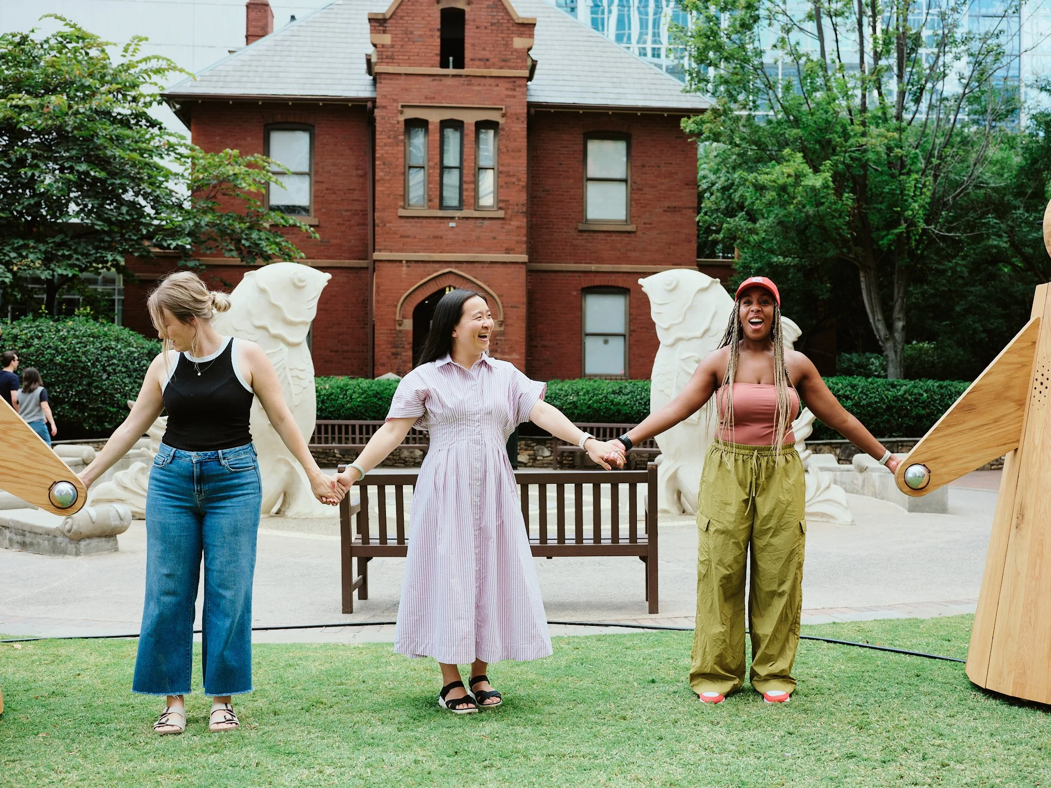 For Rail Trail Lights 2025, the Charlotte Center City Partners team commissioned local, public artist Meredith Connelly to concept and create the installations for Golden Threads. Meredith subcontracted 11 local artists to support the fabrication and installation of each art piece. Each artist received hands-on opportunities, training, and mentorship throughout the process to help support their professional development.